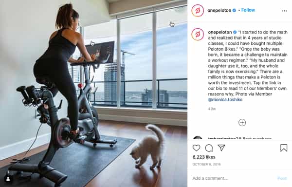 A more recent example can be seen in the marketing of high-end exercise bikes. Peloton has seen a tremendous amount of success, evidenced by the fact that they tripled their revenue in just one year. According to a WSJ interview with their brand marketing lead, Carolyn Tisch Blodgett, the company's early ads demonstrated how the product worked. Now that product awareness has risen with consumers, the brand has transitioned to a more emotional approach to defining the brand and its community of riders through the "Better Is In Us" campaign.